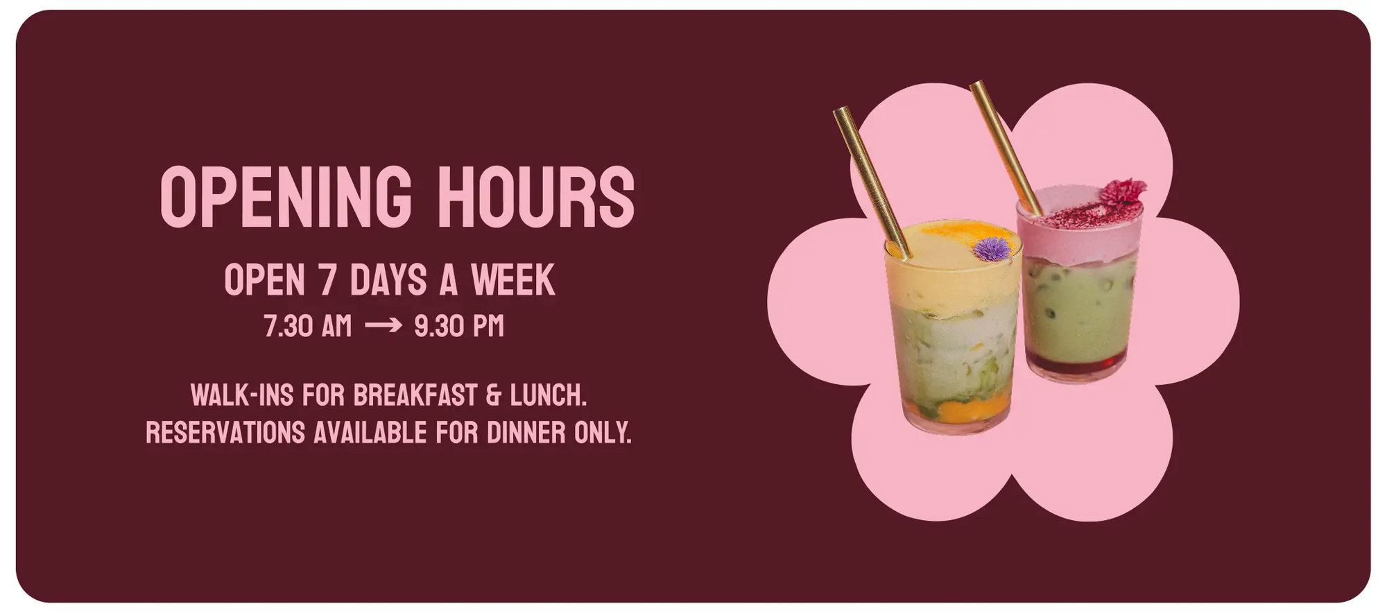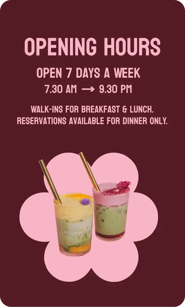 We have three locations across Bali’s most loved neighbourhoods. Visit our largest venue in Seminyak, our cosiest in Canggu, and our newest space in Uluwatu. We welcome walk-ins for breakfast and lunch at all locations. If you’re joining us for dinner, bookings can be made below.